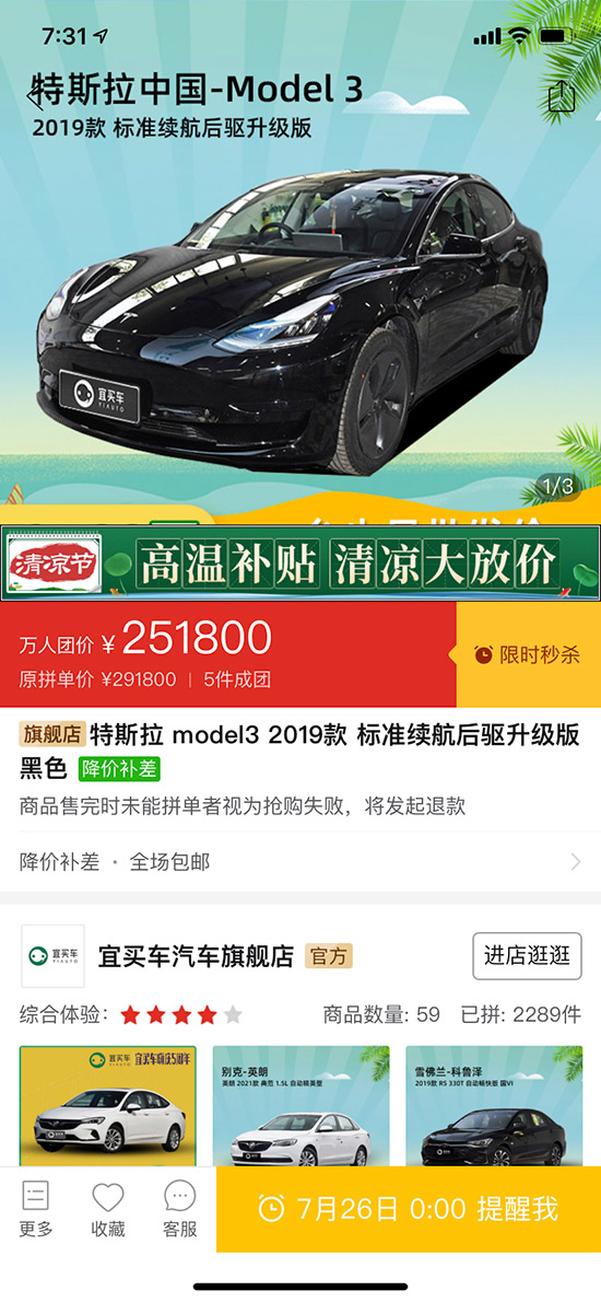 今年7月21日,连锁汽车销售平台宜买车联合拼多多推出了一场特斯拉万人团购活动。活动期间,特斯拉官方指导价为27.155万元的特斯拉Model 3 标准续航后轮驱动升级版 ,在拼多多平台上的团购价为每台25.18万元,团购价格比官方售价便宜了近2万元。