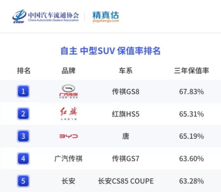 除了消费者用终端销量为这款车投票以外,在中国汽车流通协会发布的《中国汽车品牌保值率报告》中,广汽传祺GS8成为了2021和2022年度的自主中型SUV保值率第一的车型,而在2023年1月和3月的报告当中,GS8的保值率也稳居第一,这相当于二手车行业也肯定了这款车的价值。