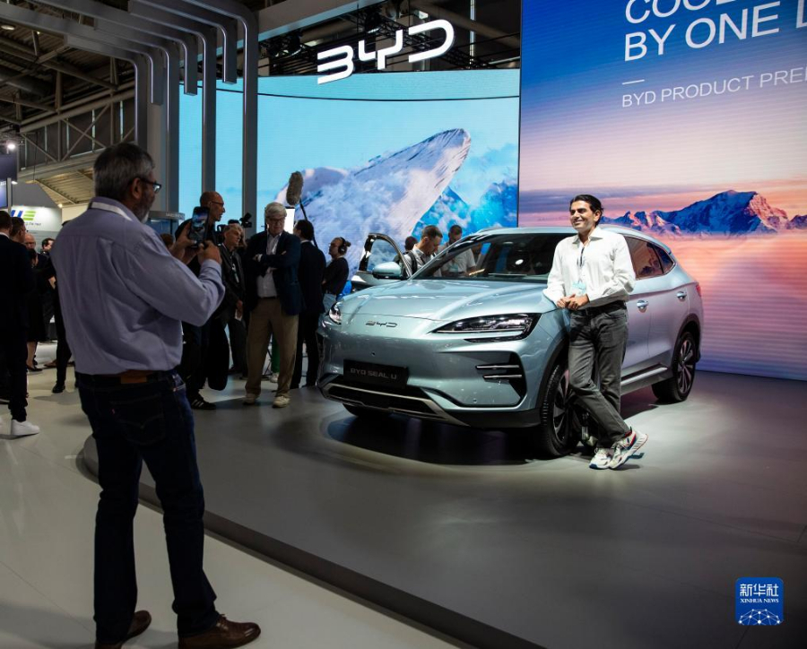 9月4日,在德国慕尼黑国际车展媒体预展上,参观者在比亚迪品牌发布会现场与BYD SEAL U汽车合影。