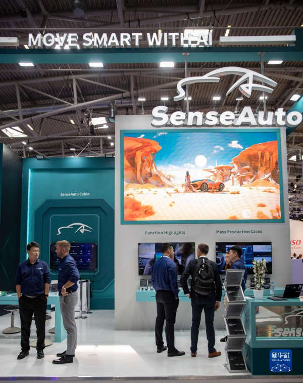 这是9月4日在德国慕尼黑国际车展媒体预展上拍摄的商汤科技展台。