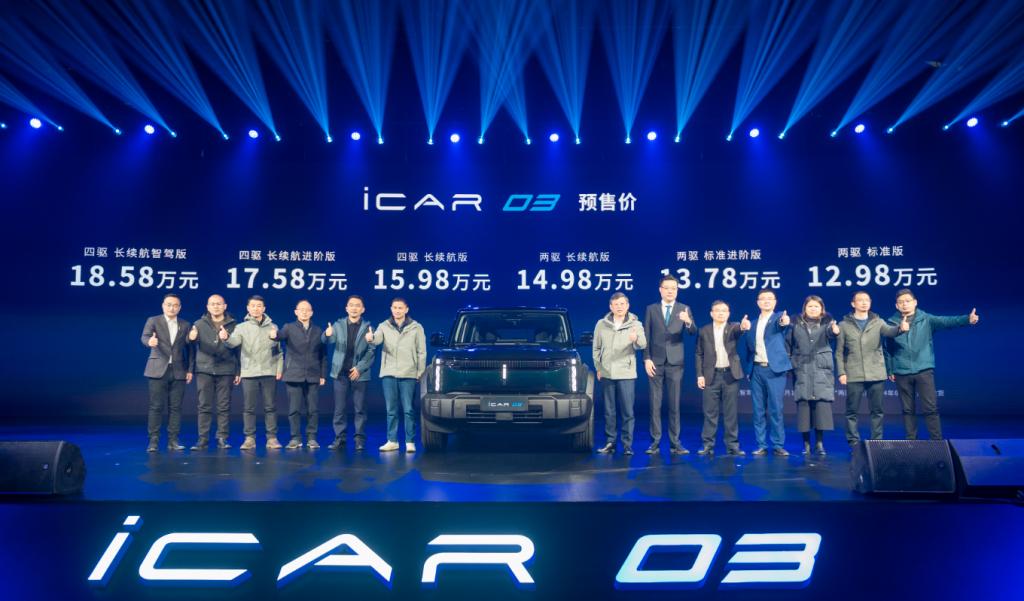 12月18日,“iCAR 03全球预售发布暨iCAR零碳智慧工厂开放日”在安徽芜湖举行,其中iCAR 03开启预售,新车拥有两驱和四驱共6个版型,提供6种外观车色和2款内饰配色选择,官方预售价12.98万元起。