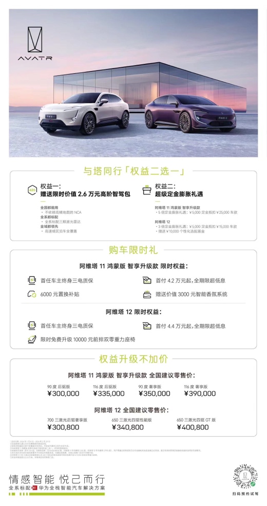 权益一,1月8日后购车的用户赠送限时价值26,000元高阶智驾包,以不依赖高精地图的NCA带来全域都领先的高速城区泊车全覆盖体验。权益二,活动期间购车用户可享5倍定金膨胀礼遇,5000定金抵扣25,000元车款,车价立减两万元。与此同时,阿维塔推出更多贴心限时权益:首任车主终身三电质保,6000元置换补贴即刻拥有;另外,全系车主可享智能香氛系统赠送,并拥有首付4.2万元起、全期限超低息的购车金融权益。与此同时,阿维塔 11 鸿蒙版智享升级款全国零售价30万- 39万元,真正做到产品升级不加价。