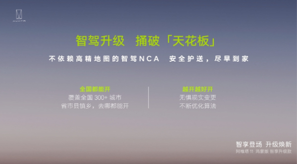 伴随着阿维塔11鸿蒙版智享升级款的上市,阿维塔“去高精地图化”智驾时代正式开启,打破“按图索骥”束缚,完美弥补当下高精地图智驾方案的不足并解锁更多高频智驾场景,城区NCA智驾功能即将一次性解锁超过300个城市,带来“全国都能开、 全国都好开”的出行体验。
