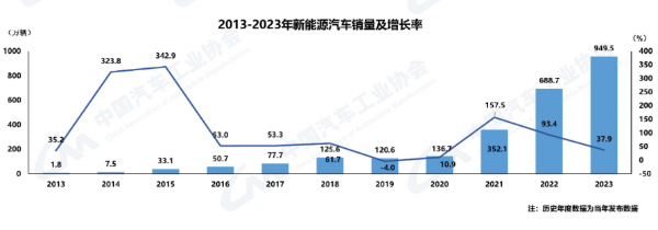 据中汽协统计分析,2023年我国新能源汽车产销分别完成958.7万辆和949.5万辆,同比分别增长35.8%和37.9%,市场占有率达31.6%。