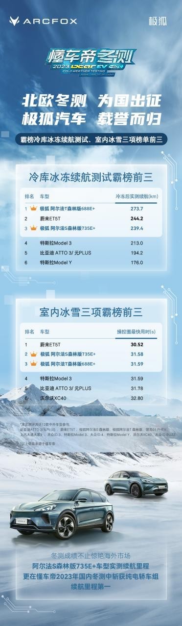 值得一提的是,就在刚刚结束的2023懂车帝冬测中,极狐汽车凭借优异的表现惊艳国内及海外市场。其中,参赛车型阿尔法S森林版735E+,以368.8的实测续航里程在国内冬测中取得纯电轿车组续航里程第一名的好成绩。而阿尔法T森林版688E+、阿尔法S森林版735E+在北欧冬测中,更是以惊人的表现,实力霸榜冷库冰冻续航测试、室内冰雪三项榜单前三,向世界展现了中国新能源汽车的卓越品质。