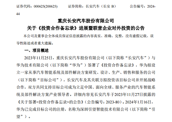 2023年11月25日,长安汽车与华为签署《投资合作备忘录》。华为拟设立一家从事汽车智能系统及部件解决方案研发、设计、生产、销售和服务的公司,双方共同支持目标公司成为立足中国、面向全球、服务产业的汽车智能系统及部件解决方案产业领导者。
