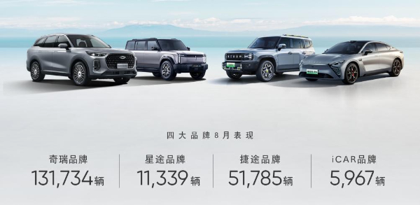 从品牌来看:四大主力乘用车品牌中,奇瑞品牌8月销量131,734辆,1-8月累计销量961,624辆,同比增长34.8%;星途品牌8月销量11,339辆,1-8月累计销量80,229辆,同比增长22%;捷途品牌8月销量51,785辆,1-8月累计销量316,446辆,同比增长95.5%,这一数字已超过捷途去年全年销量;iCAR品牌首款产品上市6个月,8月份销量5,967辆;今年以来累计销量37,681辆。