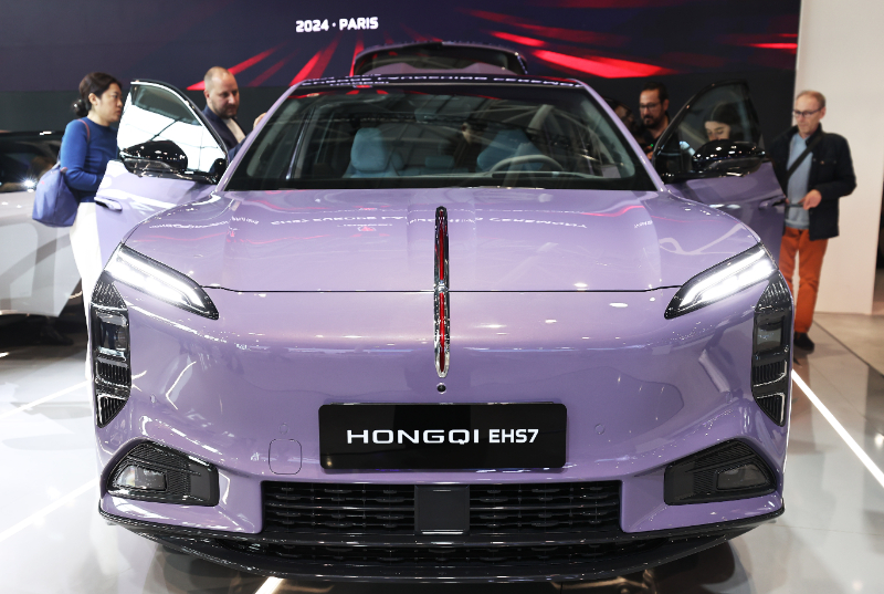 10月14日,人们在法国巴黎凡尔赛门展览中心举行的2024巴黎车展媒体开放日上参观红旗展台。新华社记者 高静 摄