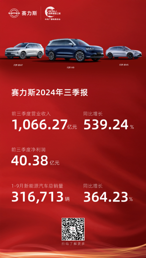 10月30日,赛力斯(601127.SH)发布2024年三季报,前三季营收1066.27亿元,同比大增539.24%;归属于上市公司股东的净利润40.38亿元。