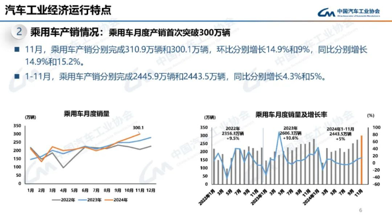 乘用车月度产销首次突破300万辆。11月,乘用车产销分别完成310.9万辆和300.1万辆,环比分别增长14.9%和9%,同比分别增长14.9%和15.2%。1—11月,乘用车产销分别完成2445.9万辆和2443.5万辆,同比分别增长4.3%和5%。