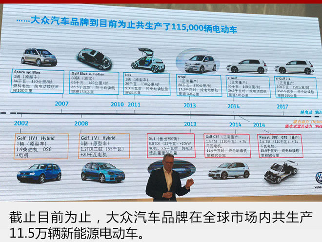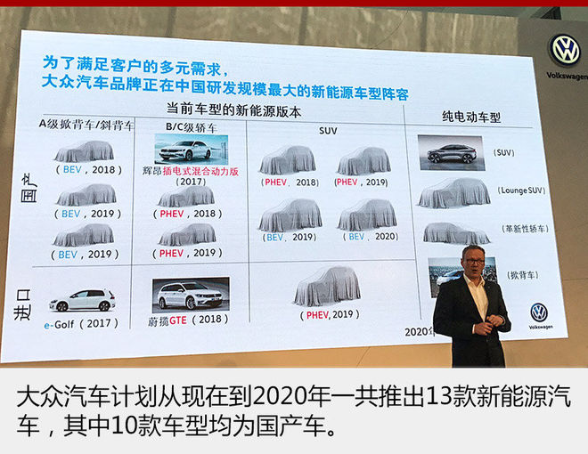 从这张规划图中能够看到,至2020年大众汽车在中国新推出13款新能源车,其中有10款车型会在国内进行本土化生产。加上已上市的e-UP!和高尔夫GTE,大众在华新能源车阵容将增至15款。另外,进口引入的e-Golf和上汽大众辉昂插电混动版将于年内率先投入市场。