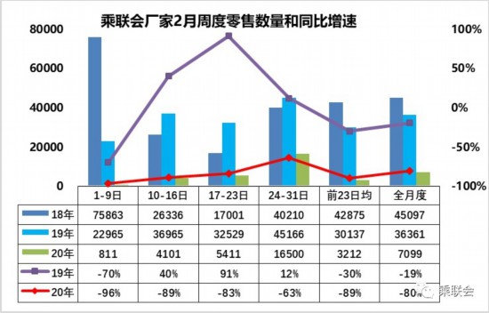 乘联会表示,初步判断2月全国乘用车市场零售增速为去年同期20%,同比下滑80%。同时,乘联会预计2020年1-2月累计同比下降幅度为41%。乘联会认为,这是受春节提前因素的正常影响和疫情冲击影响的综合体现。