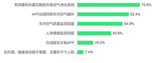 有消毒和杀菌功能的车载空气净化系统(71.9%)、APP远程控制车内空气循环(65.6%)和车内空气质量监测装置(61.3%)是意向购车者最关注的健康类功能和配置。