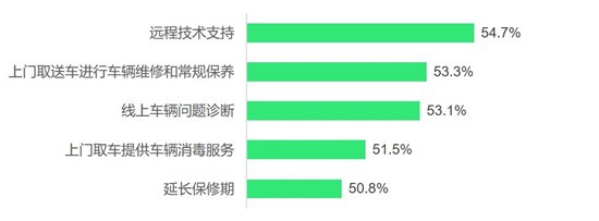 特殊时期,车主希望汽车品牌和经销商提供远程技术支持(54.7%)和线上车辆问题诊断服务(53.1%),以尽量减少进店频次。线上服务需求对厂商的数字化能力提出了更高的要求。此外,五成车主希望经销商提供上门取送车保养或消毒服务,经销商应把握上门服务机会,创造新的服务需求。