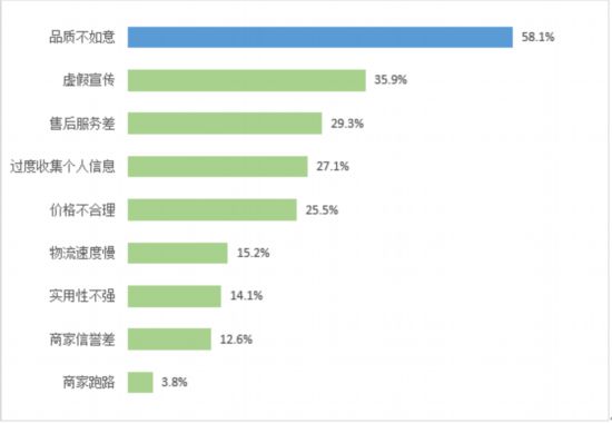 56.5%的受访者表示对当前的消费环境比较放心或非常放心。58.1%的受访者对当前商品/服务不满意的首要原因是“品质不如意”,“虚假宣传”也是受访者反映较为集中的不满意原因,占比超过35.9%。“售后服务差”(29.3%)、“过度收集个人信息”(27.1%)等方面也是造成受访者对现有消费商品和服务不满意的重要原因。