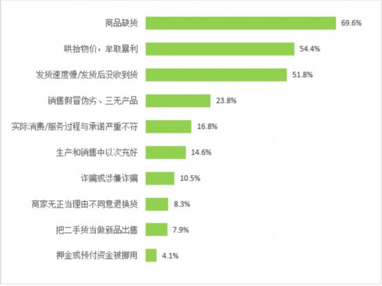 疫情期间,69.6%的受访者主要遇到“商品缺货”的消费问题;54.4%的受访者遇到“哄抬物价,牟取暴利”,51.8%的受访者遇到“发货速度慢/发货后没收到货”。