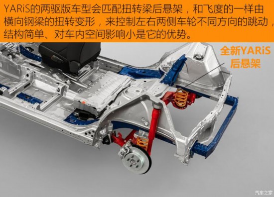 对于这些尺寸小巧的车型来说,提高车内的空间利用率非常的重要,日本工程师往往非常擅长这一点。在全新YARiS(两驱版)和飞度都选择了前麦弗逊+后扭转梁的悬架结构,这是综合性能和空间因素后最合理的设计方案。