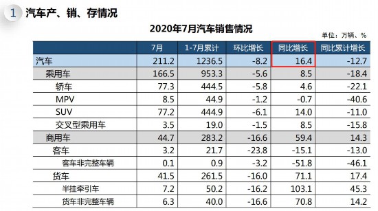 人民网北京8月11日电(王紫)8月11日,据中国汽车工业协会发布月度数据显示,7月我国汽车产销形势总体稳定,销量达211.2万辆,同比增长16.4%,其中商用车同比增速明显。