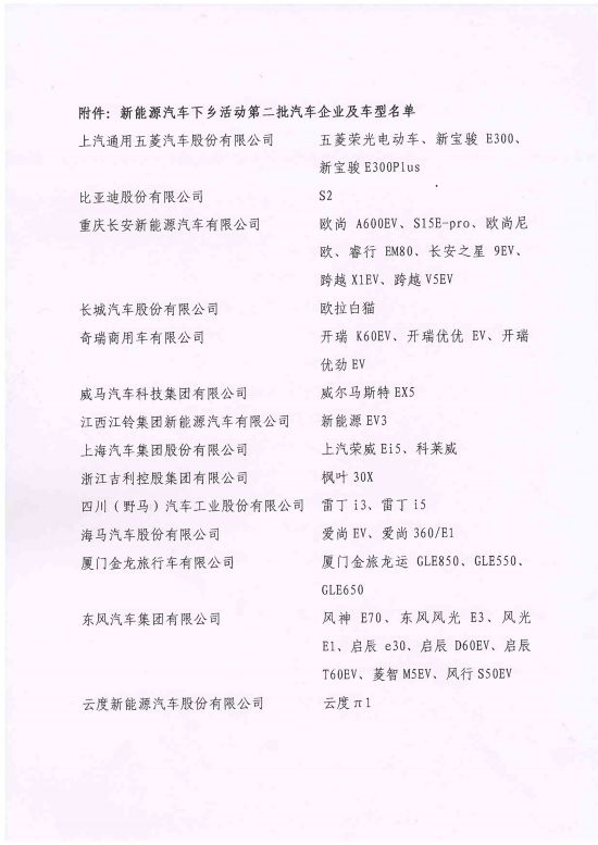 人民网北京9月2日电(王紫)9月1日,中国汽车工业协会公布了第二批参与新能源汽车下乡活动的企业和车型名单。名单中包括上汽通用五菱、比亚迪、长安汽车、长城汽车、奇瑞商用车等在内的14家企业,及其旗下的共计36款车型。