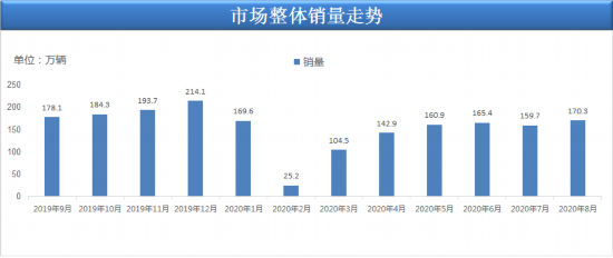 从整体市场销量情况来看,8月乘用车市场零售销量为170.3万辆,同比增长8.9%,实现自2018年5月以来的最强正增长。根据统计,今年1-8月的零售累计增速-15.2%,较1-7月累计增速提升了3.3个百分点,体现行业的快速回暖态势。