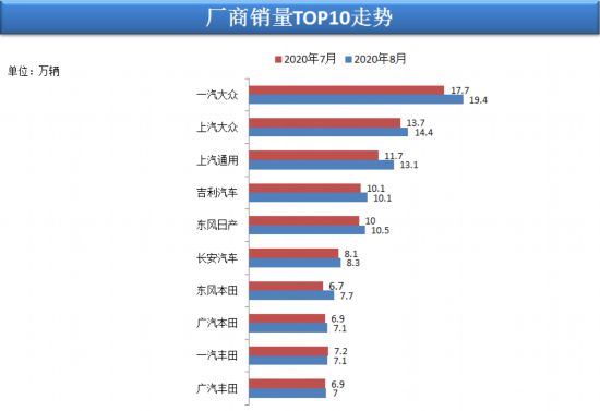 第六位到第十位分别为长安汽车、东风本田、广汽本田、一汽丰田、广汽丰田。与7月份相比,东风本田从第十位一跃到第七位,一汽丰田则从第七位滑落至第九位,广汽丰田下降一位,位列第十。