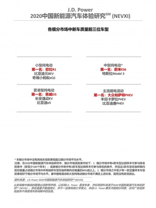 研究结果显示,上汽大众(105 个 PP100)获得插电混动车市场新车质量第一名,宝马(108个PP100)位列插电混动车市场第二位。蔚来(109 个 PP100)获得纯电动车市场新车质量第一名,特斯拉(113个PP100)和欧拉(129个PP100)位列纯电动车市场第二和第三位;车型层面,欧拉R1荣获小型纯电动细分市场第一;荣威Ei5荣获紧凑型纯电动细分市场第一;蔚来ES6摘得中型纯电动细分市场第一;大众帕萨特 PHEV 摘得主流插电混动细分市场第一;豪华插电混动和大型纯电动细分市场因为不满足细分市场颁奖条件,因而没有奖项颁出。