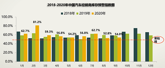 即便处于汽车市场的“金九”旺季,经销商的库存压力依然不小。昨日(10月13日),流通协会发布数据显示,9月,国内汽车经销商库存预警指数为54.0%,较上月上升1.2个百分点,较去年同期下降4.6个百分点,库存预警指数位于荣枯线之上。