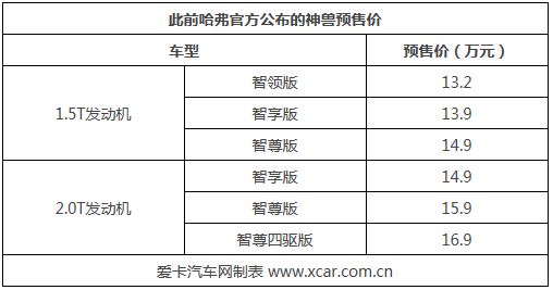 日前,爱卡汽车从相关渠道获悉,哈弗神兽预计将于广州车展上市,新车的预售价区间为13.2-16.9万元。哈弗神兽搭载了1.5T和2.0T发动机,在设计上采用了最新的家族式设计语言,无边界格栅极具家族辨识度。神兽的内饰同样是科技感十足,新车配备了14.6英寸中控液晶屏+12.3英寸液晶仪表。
