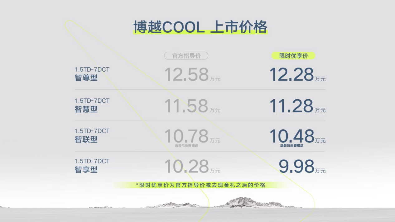 央广网4月27日消息,4月26日晚吉利汽车全新智能SUV博越COOL正式上市。新车共推出4个版型,官方指导价10.28-12.58万元。作为博越家族上市7周年的诚意之作,博越COOL不仅以超预期产品力征服用户,更在现场举行首批用户交车仪式,实现上市即交付,有望成为细分市场最具价值的爆款产品。随着博越COOL的交付,博越家族全新的双车布局也正式形成,博越COOL将与博越L共同征战10-15万级最主流的紧凑级SUV市场,助力博越家族冲击细分市场第一阵营。