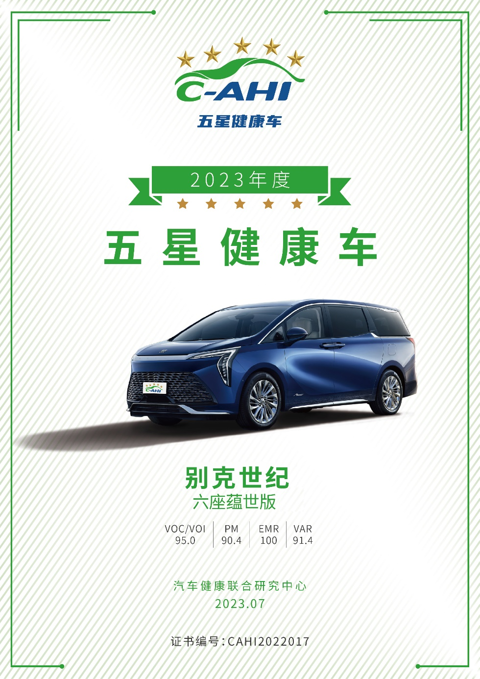 近年来,车内环境和空气质量备受关注,越来越多的用户已将环保座舱作为购车时的重要依据之一。汽车健康联合研究中心由中国汽车工程研究院股份有限公司、中国室内空气净化品牌集群及广东省室内环境卫生行业协会共建,拥有行业权威的评选体系和全面专业的测试标准。根据认证标准,别克世纪CENTURY在车内挥发性有机物(VOC)&车内气味强度(VOI)、车内颗粒物(PM)、车辆电磁辐射(EMR)、车内致敏物风险(VAR)四项测试中均以超过90的得分率获得五星成绩,整车荣膺车内健康指数“五星级”评价。其中,别克世纪CENTURY还在车辆电磁辐射(EMR)测试中获得满分佳绩。