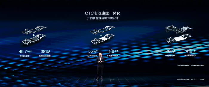 传统越野车为了提升车身扭转刚度和通过性,对大梁进行专门强化,这也将进一步加大整车重量,并抬升整车重心。DMO以创新性理念,给出“两全其美”的解决方案:将具备本征安全的刀片电池和高强度钢大车架强强融合,演化出真正的CTC电池底盘一体化技术。刀片电池既是能量体、也是结构件,不仅能保证极端越野场景下的电池安全,还能带来更多的整车安全提升。