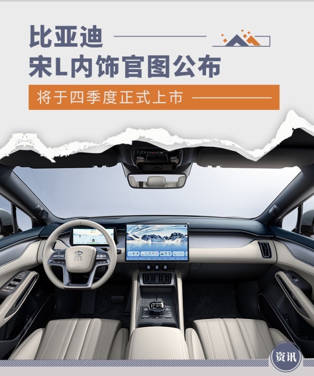 网通社快讯 比亚迪宋L内饰官图公布。新车内部采用较为简约的设计风格,并采用双拼配色,还配备大尺寸悬浮式中控屏幕、HUD抬头显示系统、水晶挡把等配置,整体豪华感、科技感十足。该车定位B级旗舰猎装SUV,基于e平台3.0打造,并将于今年四季度正式上市。
