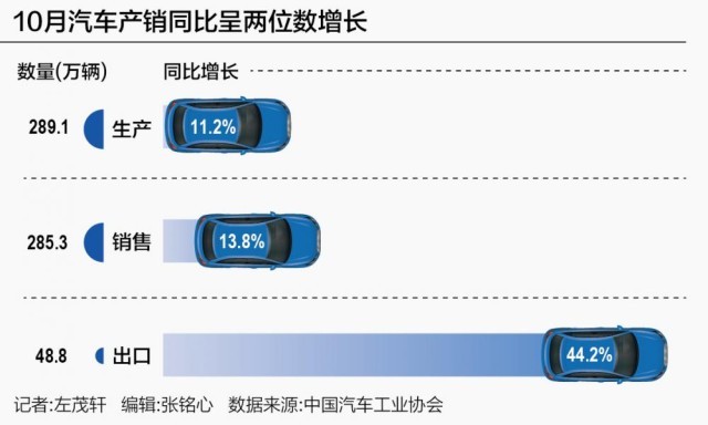 11月10日,中国汽车工业协会(下称“中汽协”)发布数据显示,10月,汽车产销分别达到289.1万辆和285.3万辆,同比分别增长11.2%和13.8%,产销量创下当月历史同期新高。