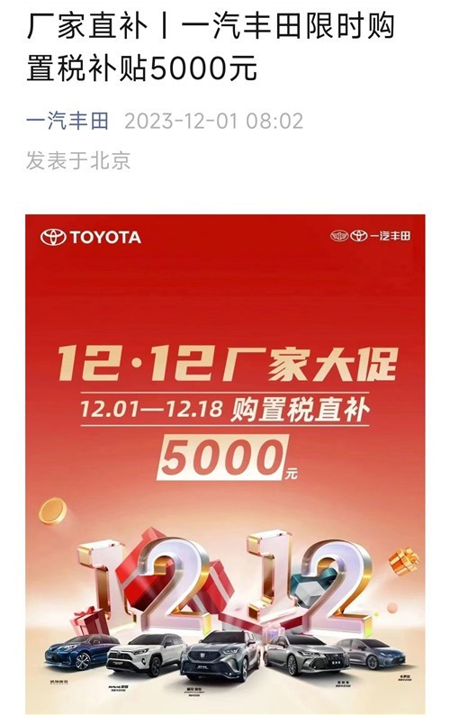 一汽丰田官微公告显示,一汽丰田宣布开启“双十二大促”,12月1日至12月18日期间,购买格瑞维亚、RAV4荣放、皇冠陆放等部分车型限时享受购置税补贴5000元,置换最高可享6000元置换补贴。