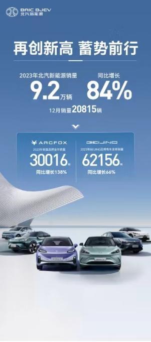 2023年,北汽蓝谷销量大幅攀升,旗下子公司北汽新能源1—12月累计销售新车92172辆,同比增长84%。其中,12月,北汽新能源单月销量20815辆。