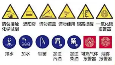 灭火器标志必须贴在车门旁或厨房附近等灭火器存放处,要求标志尺寸不小于10厘米见方,以确保在光线较暗的情况下也能快速找到;