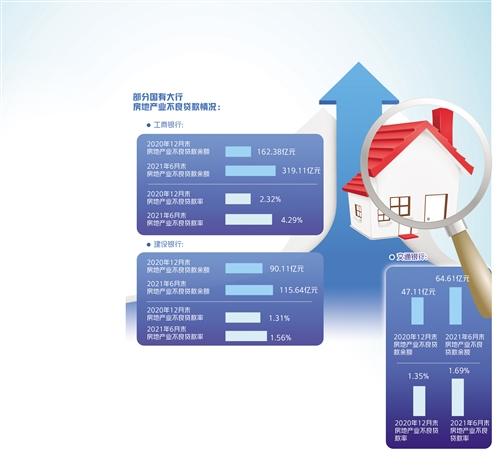 从国有大行已披露数据看,截至2021年6月末,中国工商银行、中国建设银行、交通银行的房地产业不良贷款余额分别为319.11亿元、115.64亿元、64.61亿元,较去年年末上升156.73亿元、25.53亿元、17.50亿元;房地产业不良贷款率分别为4.29%、1.56%、1.69%,较去年年末上升1.97个百分点、0.25个百分点、0.34个百分点。