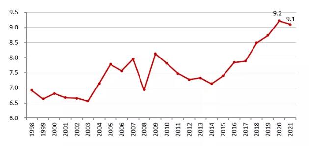 报告称,根据前文提到的房价收入比公式,计算得出2021年全国商品住宅房价收入比为9.1,相比2020年的9.2小幅回落。总的来说,房价收入比回落主要有两个原因。一是房价涨幅连续三年不断收窄;二是经济稳定恢复,2021年城镇居民人均可支配收入增速出现了较大幅度的增加,收入增速远高于房价涨幅。