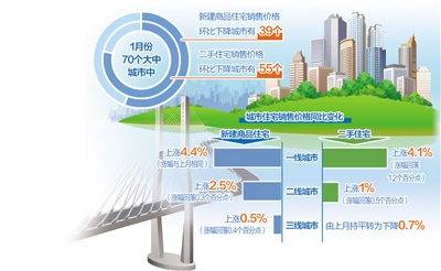 1月份,70个大中城市中,新建商品住宅和二手住宅销售价格环比下降城市分别有39个和55个,比上月分别减少11个和8个。