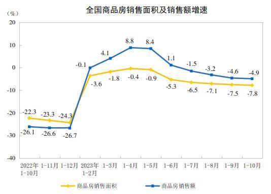 1—10月份,商品房销售面积92579万平方米,同比下降7.8%,其中住宅销售面积下降6.8%。商品房销售额97161亿元,下降4.9%,其中住宅销售额下降3.7%。