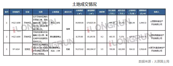 朗润解析:本周土地成交三宗,其中SP-1614位于五龙口,本地块约111亩,总建面约26万,楼面价3,918元/㎡,属中小规模体量,规划有幼儿及小学用地,周边多个新建和在建的居民小区,人口众多,且人文气息浓厚,发展成熟,万科以10.2亿元拿下SP-1614五龙口一商住地,溢价率30.6%,该宗地同时还需配建5%保障房,预计未来将会是万科在太原的另一个高端项目;HGZ-1609为小米国际项目用地;HGZ-1608位于万柏林区南内环西街以南、西苑南街以西、九院沙河以北、西北环高速公路以东,由路桥二公司开发案名拟为“路桥金泽华府”预计为品质刚需项目。
