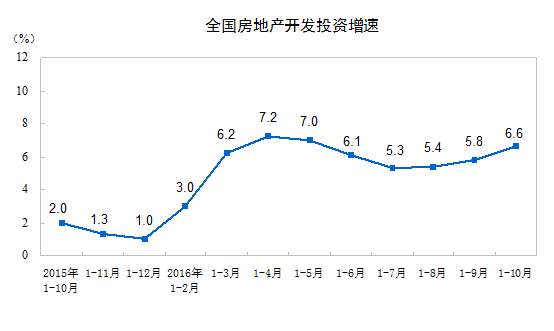 2016年1-10月份,全国房地产开发投资83975亿元,同比名义增长6.6%,增速比1-9月份提高0.8个百分点。其中,住宅投资56294亿元,增长5.9%,增速提高0.8个百分点。住宅投资占房地产开发投资的比重为67.0%。