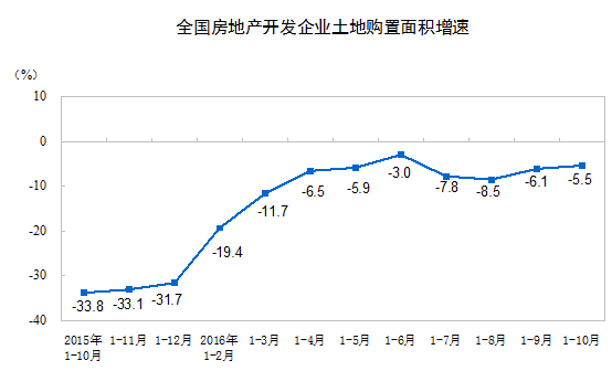 1-10月份,房地产开发企业土地购置面积16873万平方米,同比下降5.5%,降幅比1-9月份收窄0.6个百分点;土地成交价款6764亿元,增长16.7%,增速提高3.4个百分点。