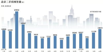 据我爱我家集团市场研究院统计,4月北京二手住宅共网签13673套,同比2017年4月下滑19.1%,环比2018年3月上升22.6%。虽然同比仍在下降,但4月的二手房网签量是去年5月至今12个月里的最高值。