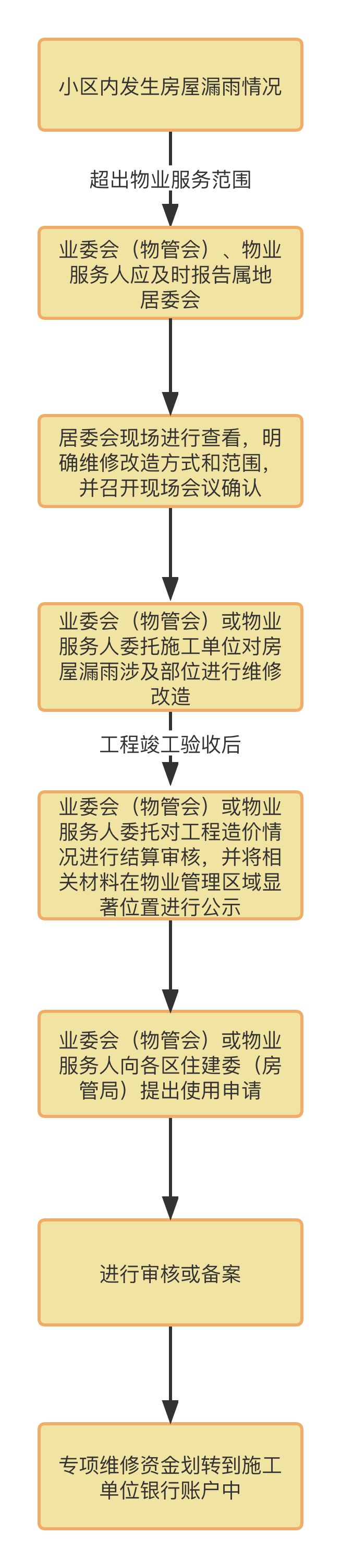 由属地居(村)民委员会召集业委会(物管会)、物业服务人及相关业主等共同到现场对漏雨情况进行实地查看,明确维修改造方式和范围,并召开现场会议确认。