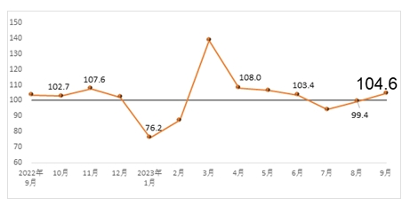 据中国建筑材料联合会发布的数据显示,2023年9月份建筑材料工业景气指数为104.6点,较上月回升5.2点,高于临界点,处于景气区间,建筑材料工业运行有所恢复。