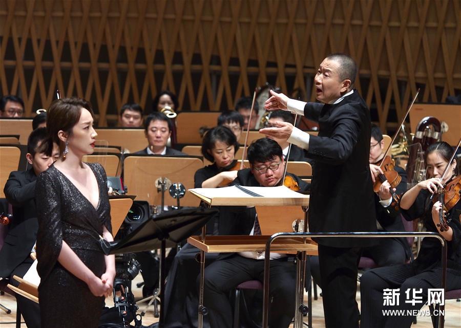 7月29日晚,作曲家谭盾(前右)在2020上海夏季音乐节闭幕音乐会上指挥。 当日,2020上海夏季音乐节在上海交响乐团音乐厅闭幕。闭幕音乐会上演出了作曲家谭盾创作并指挥的《敦煌·慈悲颂》。 新华社记者 任珑 摄