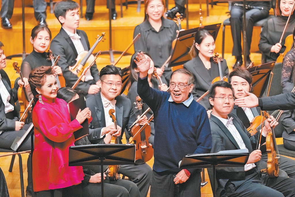 吴碧霞、黄训国的演唱同样精彩,特别是在《小河淌水》《看秧歌》等选段中,吴碧霞的美妙高音与混声合唱的互动鲜明流畅,总博得热烈喝彩。最后一曲《孳孳》唱响,余韵中,鲍元恺登台向观众致意,笔耕不辍、用几十载时光丰盈“炎黄风情”的作曲家,收获全场经久不息的掌声。