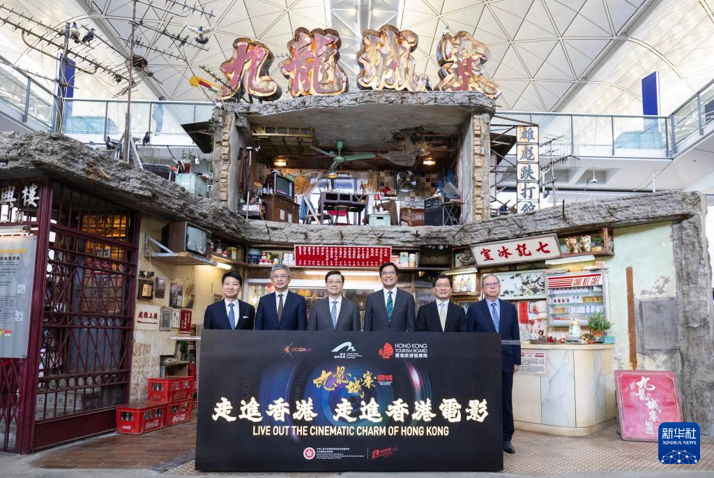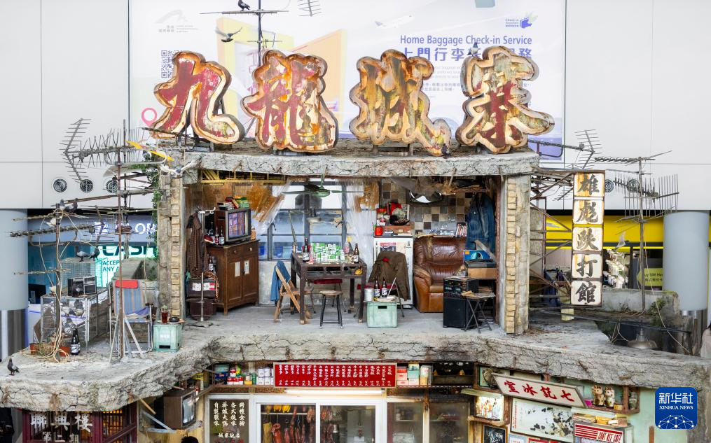 新华社香港10月7日电 香港国际机场接机大厅,一座约6.5米高的双层旧建筑物屋顶亮着“九龙城寨”霓虹灯牌,吸引许多旅客驻足欣赏。7日,以“走进香港 走进香港电影”为主题的展览在香港国际机场举行开幕仪式,电影《九龙城寨之围城》多个拍摄场景一一重现。