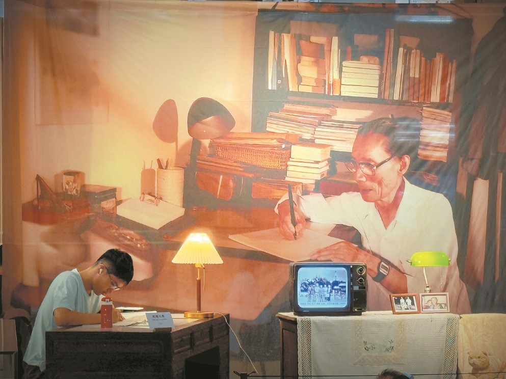 上图东馆手稿主题馆展览现场,小读者在主视觉区的仿真书桌与夏衍“对坐”。(主办方供图)